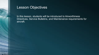 This document provides an overview of airworthiness directives, service bulletins, and maintenance requirements for aircraft. It defines airworthiness directives as legally enforceable regulations issued by the FAA to correct an unsafe condition. Service bulletins are notices from manufacturers about product improvements. The document outlines required inspections, owner responsibilities, and record keeping duties. It also explains how to find current airworthiness directives and service bulletins on the FAA and manufacturer websites.