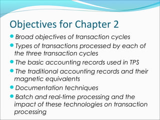 The document outlines the objectives and key concepts of transaction cycles and accounting information systems. It discusses the three transaction cycles - expenditure, conversion, and revenue - and the basic accounting records used in traditional and computer-based systems, including source documents, journals, ledgers, and documentation techniques like entity relationship diagrams and flowcharts. It also explains the differences between batch processing and real-time systems.