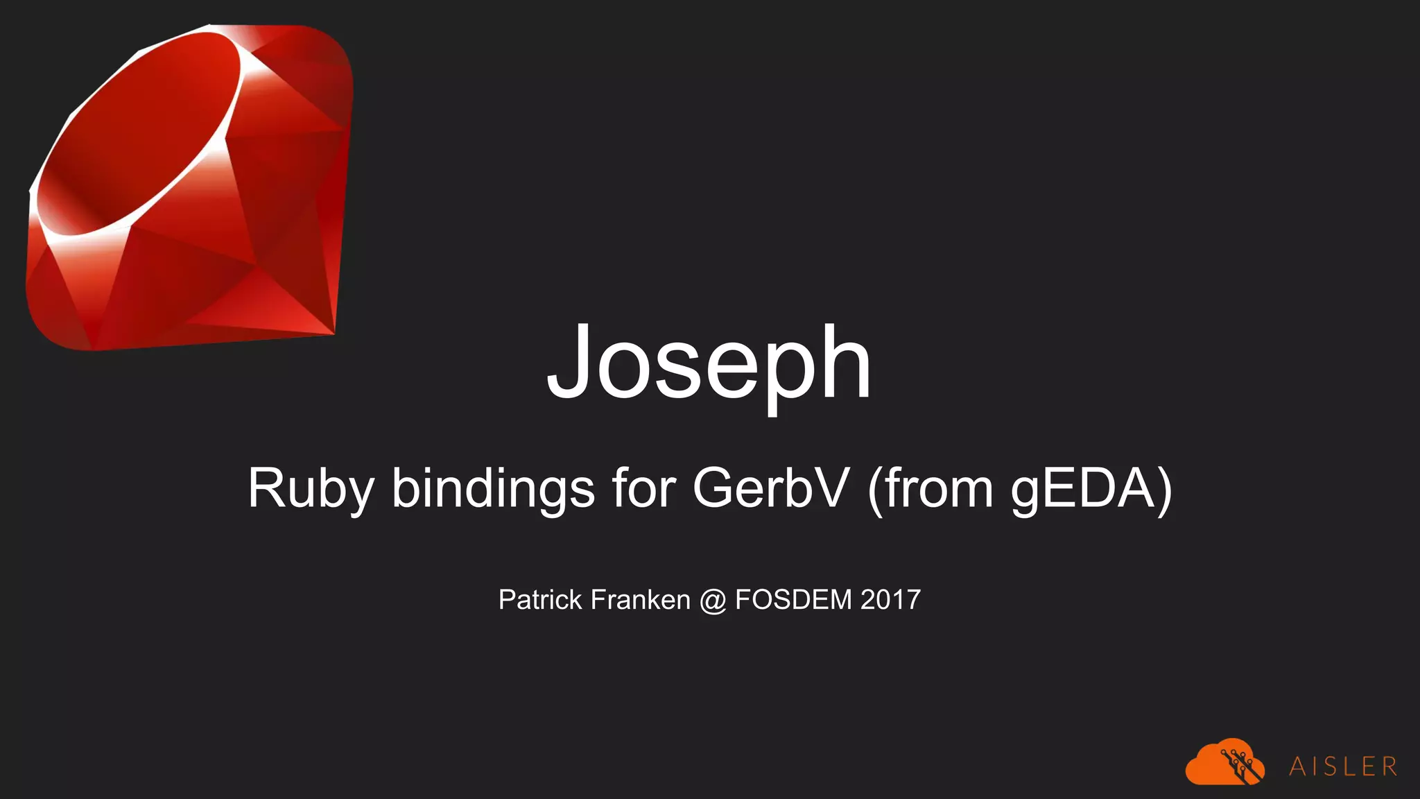 Joseph is a Ruby library that interfaces with Libgerbv, an open source CAM tool for processing Gerber files. It allows incorporating Gerber parsing, editing, exporting, and rendering into other programs without needing a UI. The document demonstrates Joseph's usage and highlights that it is easy to install, has no UI requirement, is battle proven, and high performance. It encourages using, spreading the word about, and contributing to Joseph's development and testing.