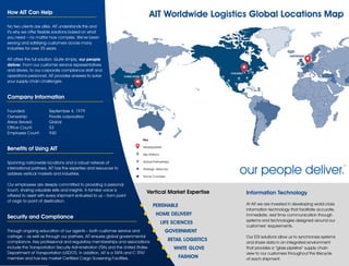 AIT Worldwide Logistics is a global logistics and supply chain management company founded in 1979 that provides transportation and logistics services across various industries. It has 53 offices worldwide and 940 employees. AIT develops world-class information technology solutions to facilitate real-time communication and visibility across its customers' supply chains. It offers flexible solutions tailored to customers' specific needs through air and ocean freight forwarding, ground transportation, customs brokerage, and value-added services.