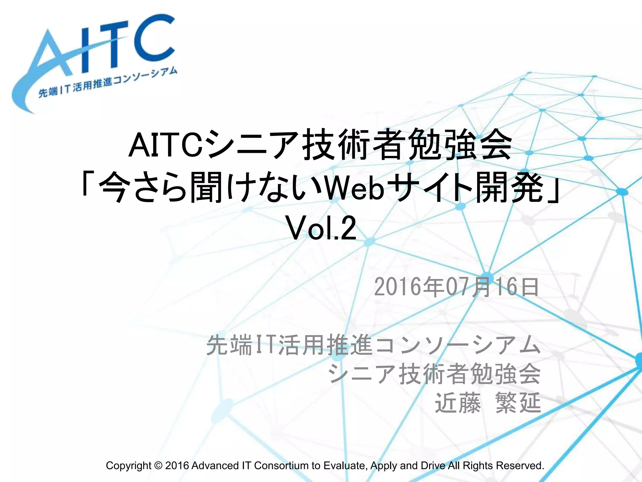 Advanced IT Consortium to Evaluate, Apply and Drive All Rights Reserved. AITCシニア技術者勉強会 「今さら聞けないWebサイト開発」 Vol.2 2016年07月16日 先端IT活用推進コンソーシアム シニア技術者勉強会 近藤 繁延