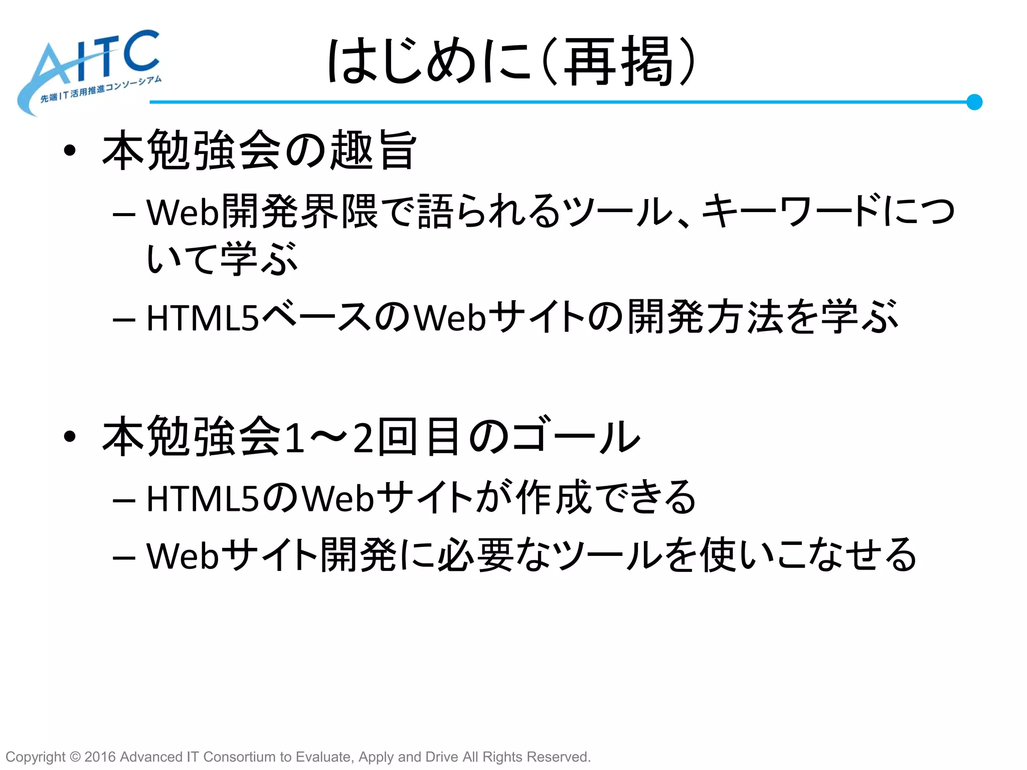 Advanced IT Consortium to Evaluate, Apply and Drive All Rights Reserved. はじめに(再掲) • 本勉強会の趣旨 – Web開発界隈で語られるツール、キーワードにつ いて学ぶ – HTML5ベースのWebサイトの開発方法を学ぶ • 本勉強会1~2回目のゴール – HTML5のWebサイトが作成できる – Webサイト開発に必要なツールを使いこなせる