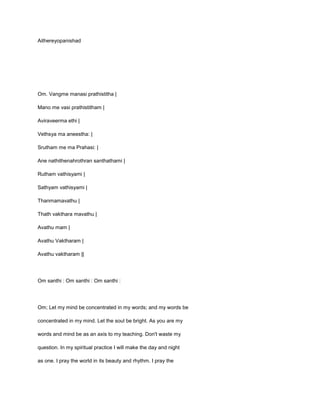 The document discusses teachings from the Aitareya Upanishad, focusing on the creation of the world and the relationship between the soul and the body. It outlines a philosophical journey of the soul through various stages of existence, emphasizing the connection between the individual self and the divine. The text culminates in reflections on the nature of existence and the pursuit of spiritual knowledge, ultimately expressing a desire for peace and enlightenment.