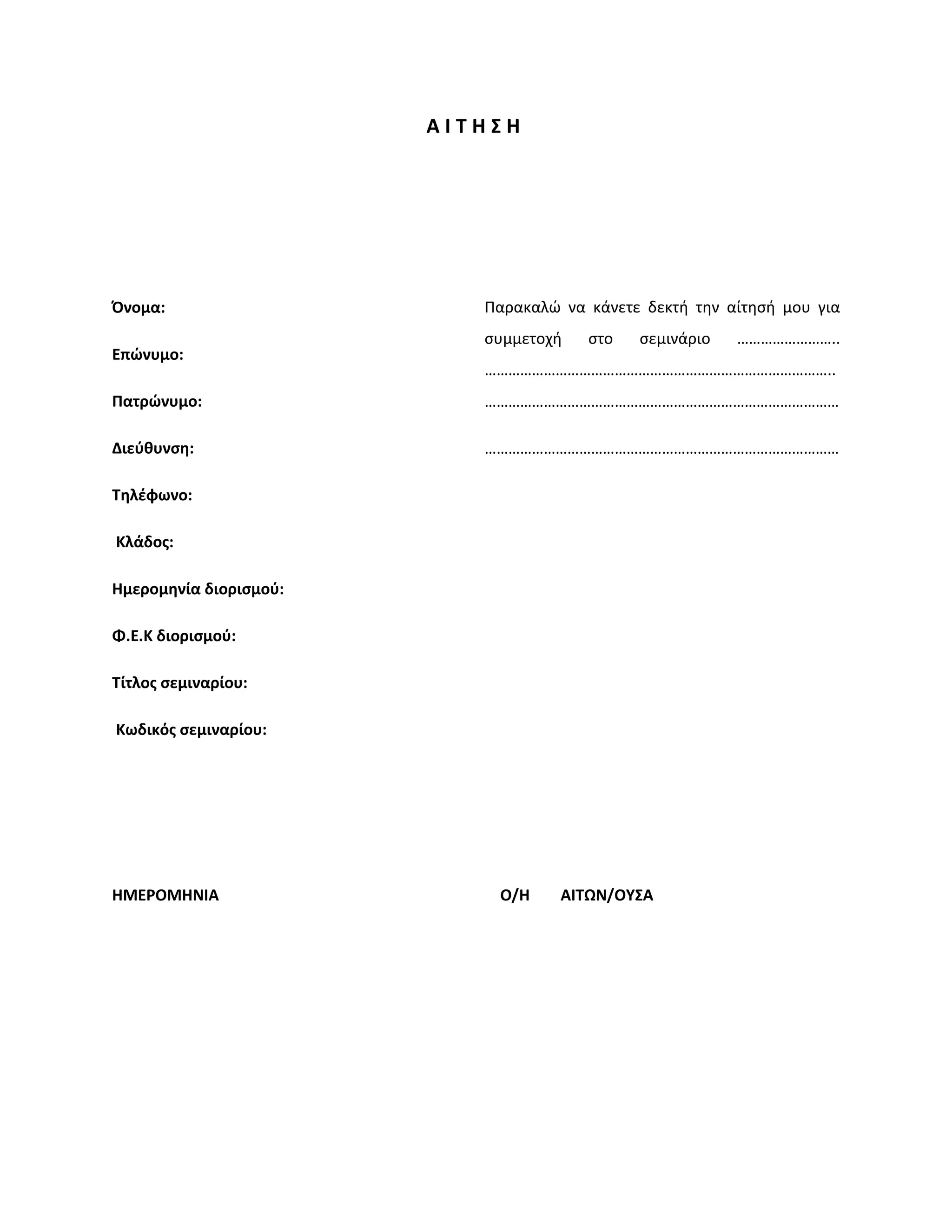 Παρακαλώ να κάνετε δεκτή την αίτησή μου για συμμετοχή στο σεμινάριο …………………….. Επώνυμο: …………………………………………………………………………….. Πατρώνυμο: ……………………………………………………………………………… Διεφθυνςη: ……………………………………………………………………………… Σηλζφωνο: Κλάδοσ: Ημερομηνία διοριςμοφ: Φ.Ε.Κ διοριςμοφ: Σίτλοσ ςεμιναρίου: Κωδικόσ ςεμιναρίου: ΗΜΕΡΟΜΗΝΙΑ Ο/Η ΑΙΣΩΝ/ΟΤΑ
