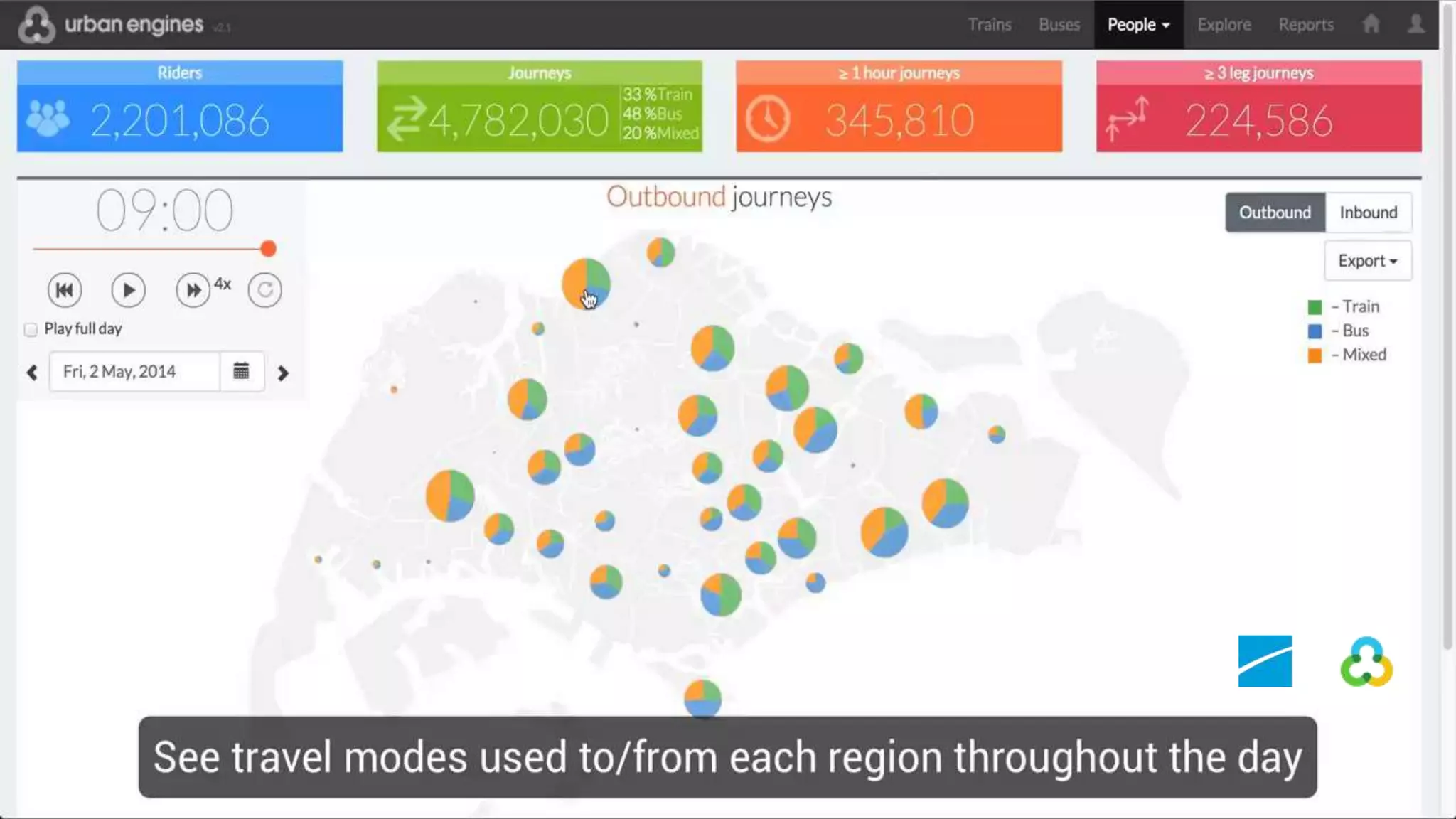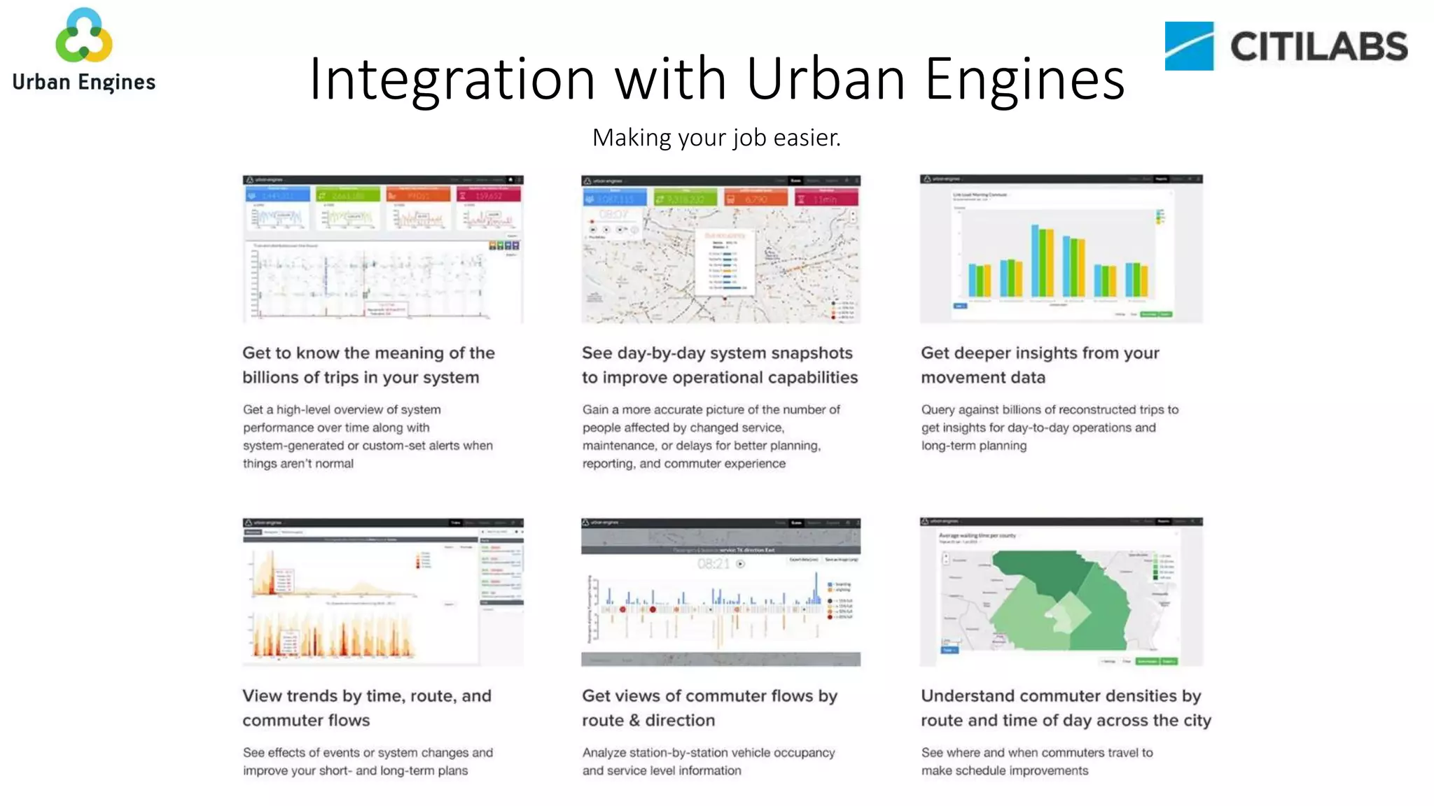 Urban Engines provides a digital replica of public transport systems that brings together various data sources to create a comprehensive understanding. This includes ticketing data, passenger counts, vehicle telemetry, revenue data, and survey results. The digital replica acts as a simulator to test scenarios in a data-driven environment. The latest version of Cube software features enhancements such as support for 64-bit applications, license borrowing capabilities, ArcGIS version 10.4 support, and improved network editing and visualization tools for public transport analysis. It also includes new functionality for outputs, urban traffic analysis, and accessibility measures.