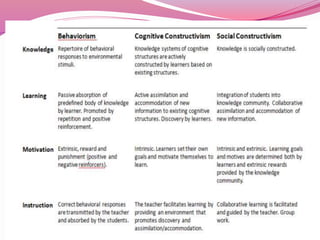 The document discusses cognitive constructivism theory, which is based on Piaget's view that learning involves actively constructing new knowledge rather than passively receiving information. According to cognitive constructivism, learning occurs as individuals build their own understanding by assimilating new experiences into existing cognitive schemas through active thinking and problem solving. Effective teaching provides experiences for students to engage in discovery learning and accommodate new information into their existing knowledge framework.