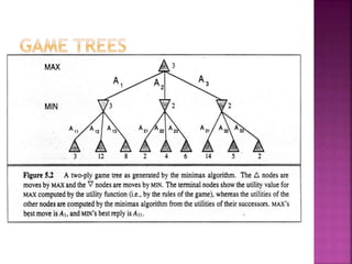 The document discusses game theory and algorithms for game playing in artificial intelligence, including minimax, alpha-beta pruning, and Monte Carlo tree search. Minimax is a decision-making algorithm that works by choosing the option that maximizes the minimum payoff. It assumes both players play optimally. Alpha-beta pruning improves on minimax by pruning branches that cannot affect the outcome. Monte Carlo tree search is a technique that builds a search tree using random simulations rather than exhaustive search.