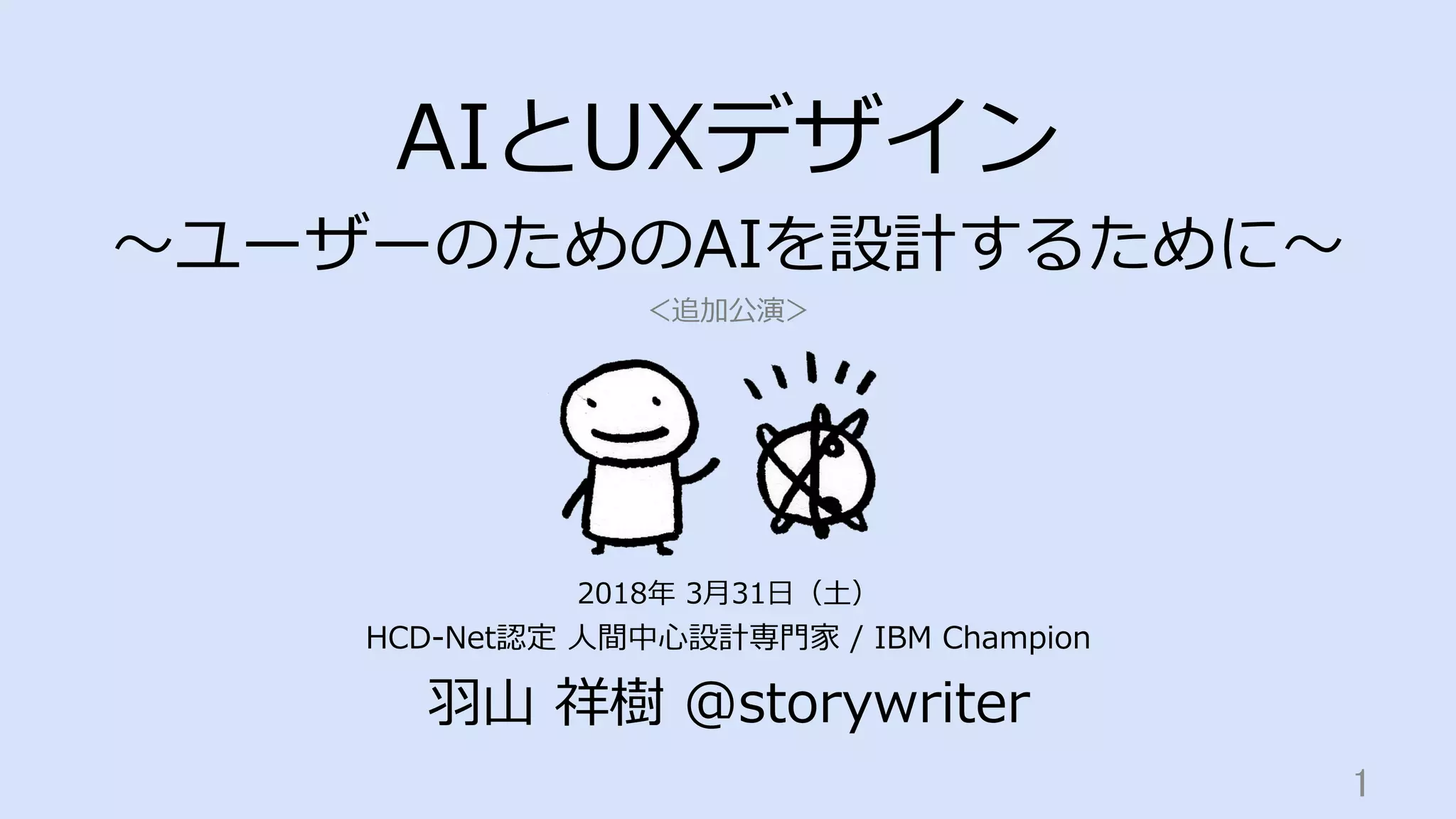 2018年3月31日 「第22回 Machine Learning 15minutes!」でのスライドです。HCD-Net認定人間中心設計専門家として、また #IBMChampion として、ユーザーとAIのインタラクションの設計についてお話しします。 #IBMChampion イベントのページ: https://machine-learning15minutes.connpass.com/event/78109/