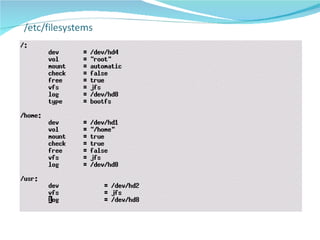 #155 mount 命令用于挂接文件系统。 在 /etc/filesystems 文件中属性 mount 为 true 或 automatic 的文件系统在系统启动时自动挂接。 mount -a | [-t type | device | node:directory ] directory umount|unmount fs_name | -t type 使用 -t type 选项可以一次挂接或卸载所有在 /etc/filesystems 中属性 Type 为 type 的文件系统。