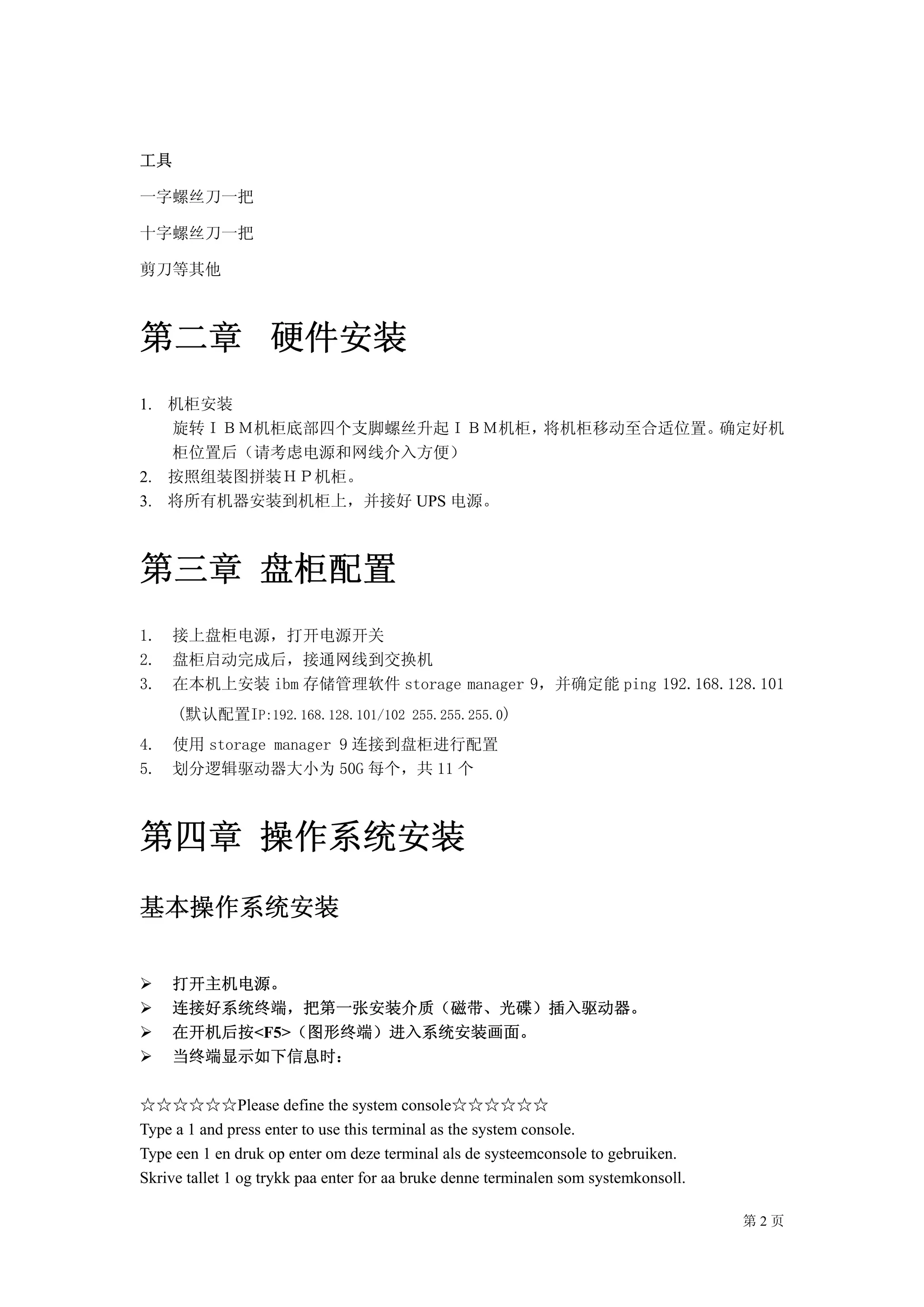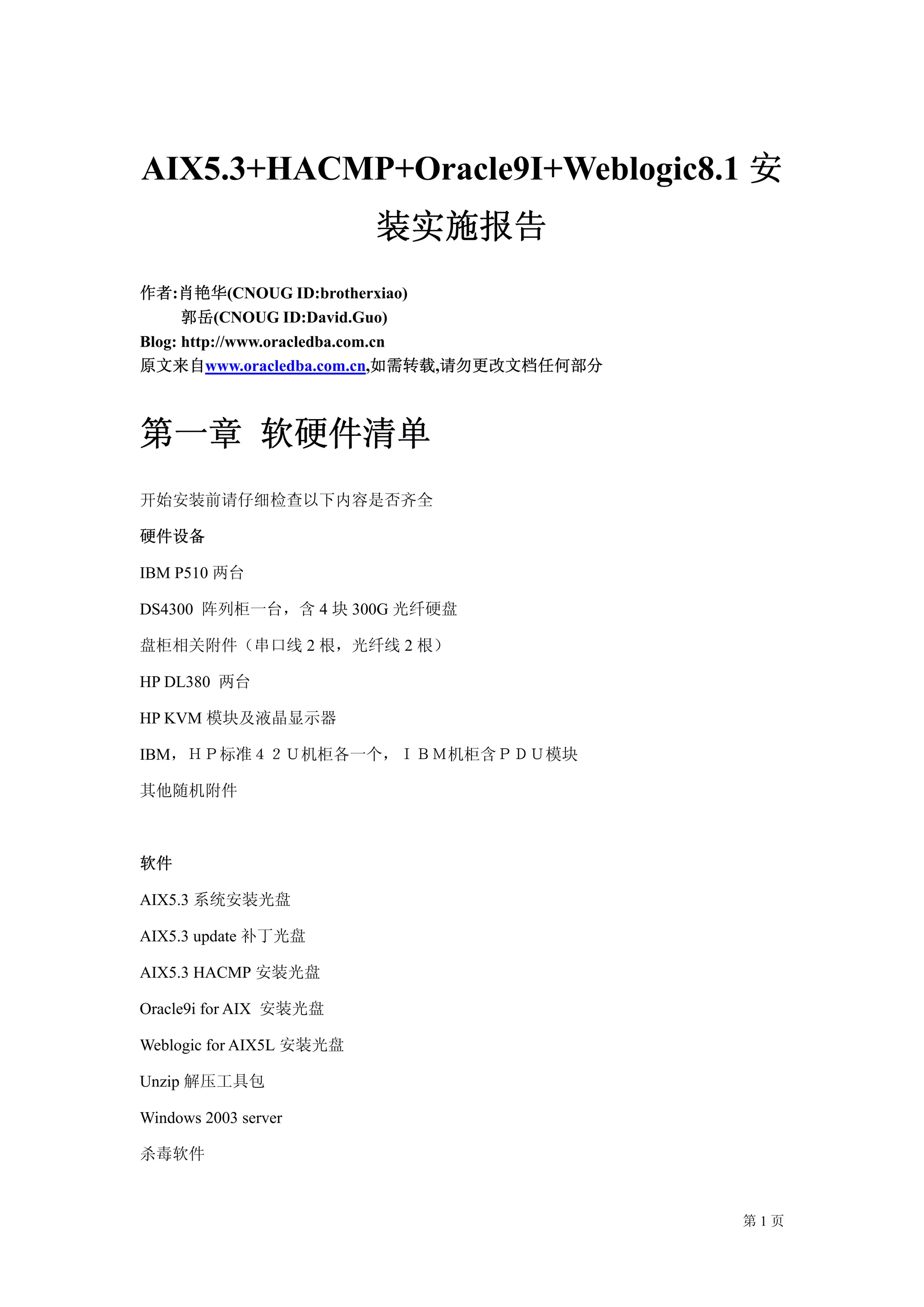 The document provides instructions for installing AIX5.3, HACMP, Oracle9i, and Weblogic 8.1 on IBM P510 servers with attached storage. It outlines the required hardware, including servers, storage arrays, and networking equipment. It then details the steps for hardware installation, disk array configuration, operating system installation, software package installation, system configuration, and volume group creation for database storage.
