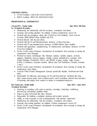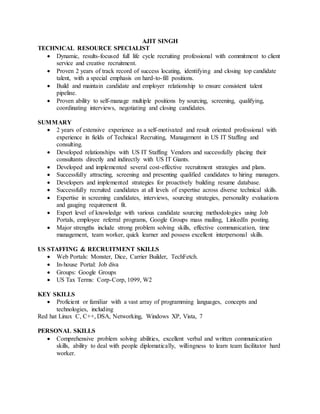 The document outlines the experience and qualifications of Ajit Singh, including over 2 years of experience as a technical resource specialist and recruiter. He has expertise in screening and placing candidates for a variety of technical roles across different industries. Some of the key clients and companies he has worked with include CNH, Alcon Labs, Novartis, Bristol Myers Squibb, TCS, Goldman Sachs, Caterpillar, Dow Chemicals, AT&T and Bank of America. He has a proven track record of successfully sourcing, qualifying, and placing candidates for both contract and full-time positions.