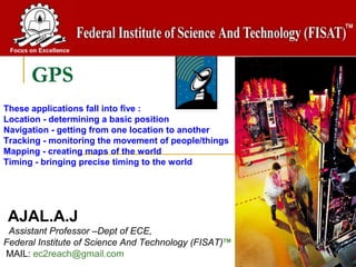 The document discusses the fundamentals of GPS technology, including its history, components, and functionality. It outlines the segments of GPS, such as space, control, and user segments, as well as its method of determining location through signal timing from satellites. Additionally, it highlights the challenges and advancements in GPS applications for navigation and tracking.