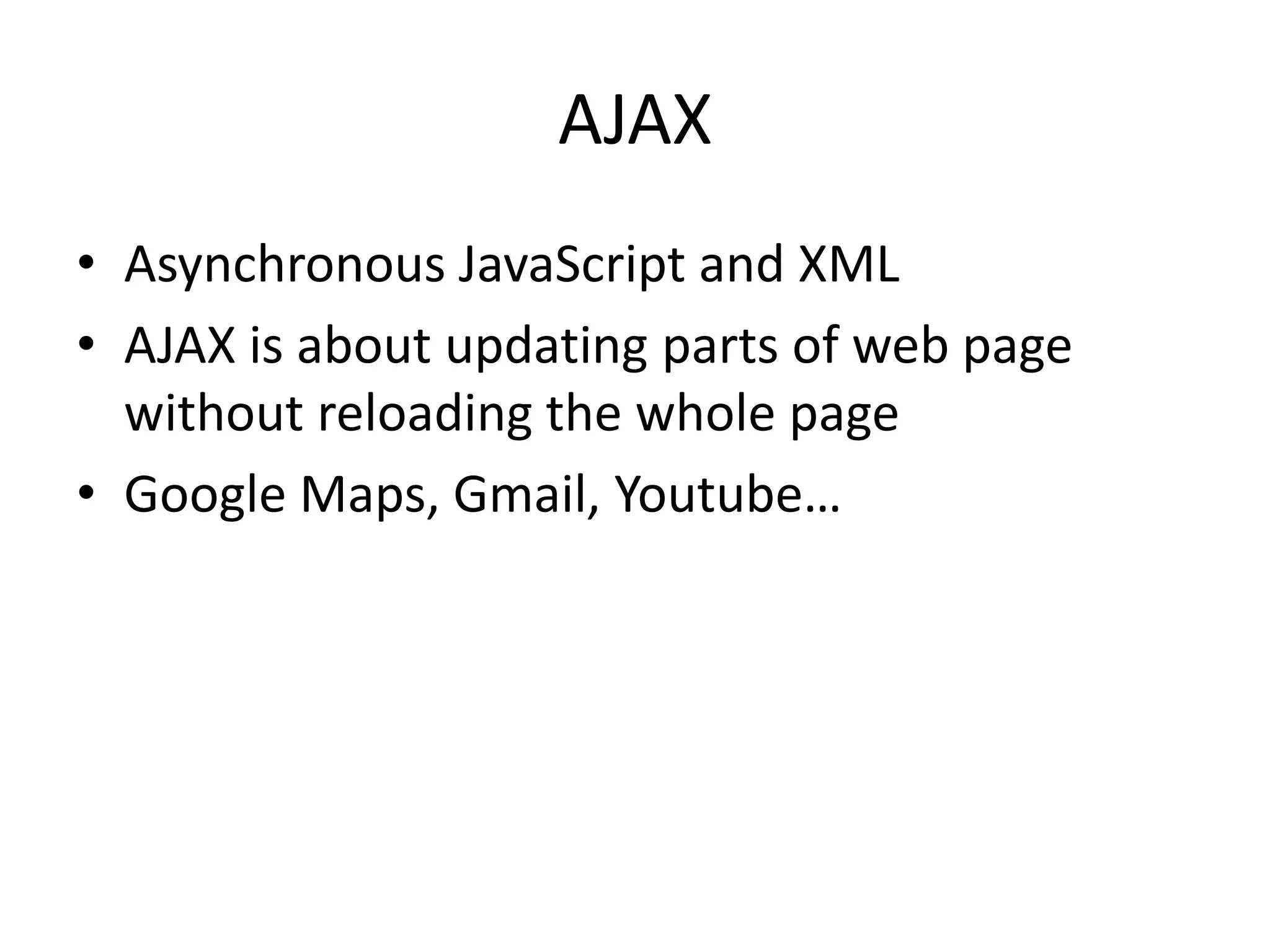 AJAX allows updating parts of a web page without reloading the entire page. It uses the XMLHttpRequest object to asynchronously send and receive data from a web server in the background. Common techniques include using JavaScript and DOM manipulation to update specific elements on a page based on the asynchronous response received in JSON, XML, HTML or plain text format from the server. Popular sites like Gmail, Google Maps, and YouTube use AJAX to provide dynamic and interactive experiences on the web.