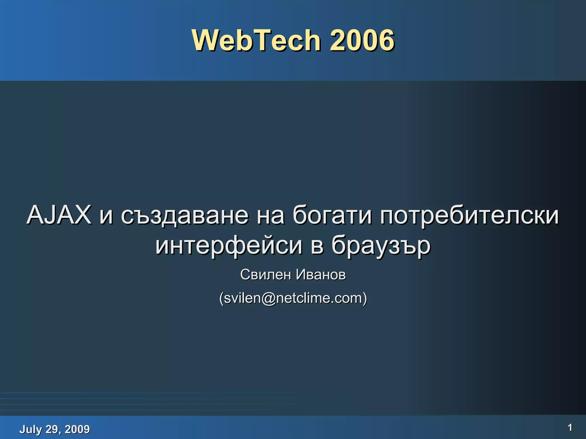Лекцията цели да представи личния опит на автора в разработката на богати потребителски интерфейси базирани на AJAX. Ще бъдат демонстрирани различни шаблони, използвани при изграждането на JavaScript класова йерархия за моделиране на входни контроли, позволяващи сложни взаимодействия и валидация на входа при голяма степен на независимост от представянето. Авторът ще дискутира различни ограничения в съвременните браузъри и начините те да бъдат