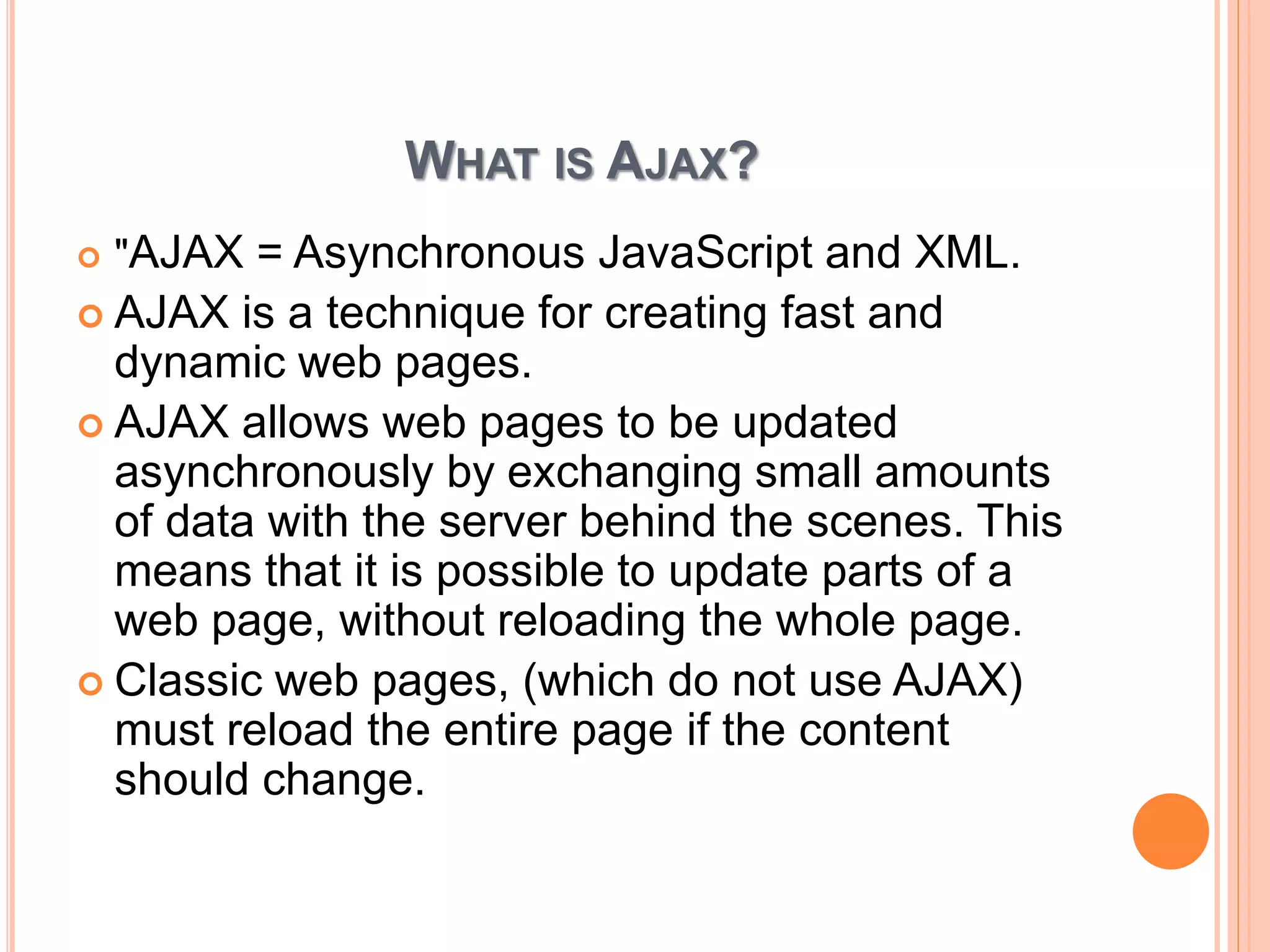 Ajax (Asynchronous JavaScript and XML) is a technique for creating fast, dynamic web pages that allows partial updates without reloading the entire page. It enhances user experience by enabling rich interfaces and supports dynamic data exchange between the client and server. Typical use involves a JavaScript XMLHttpRequest, which communicates with the server and updates the web page asynchronously.
