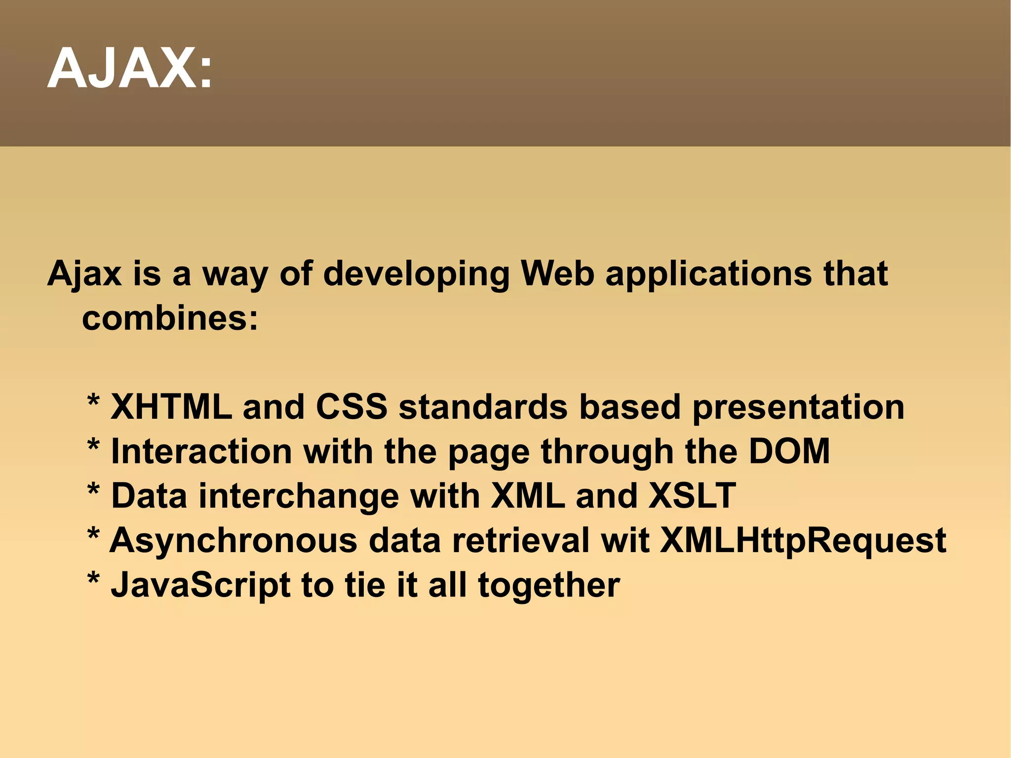 AJAX allows for asynchronous data retrieval and interaction with web pages. It uses a combination of XHTML, CSS, JavaScript, and the XMLHttpRequest object to retrieve and update content without reloading the entire page. The XMLHttpRequest object sends and receives data from the server in the background without interfering with the display and behavior of the existing page. This allows for asynchronous updating of content within a page.