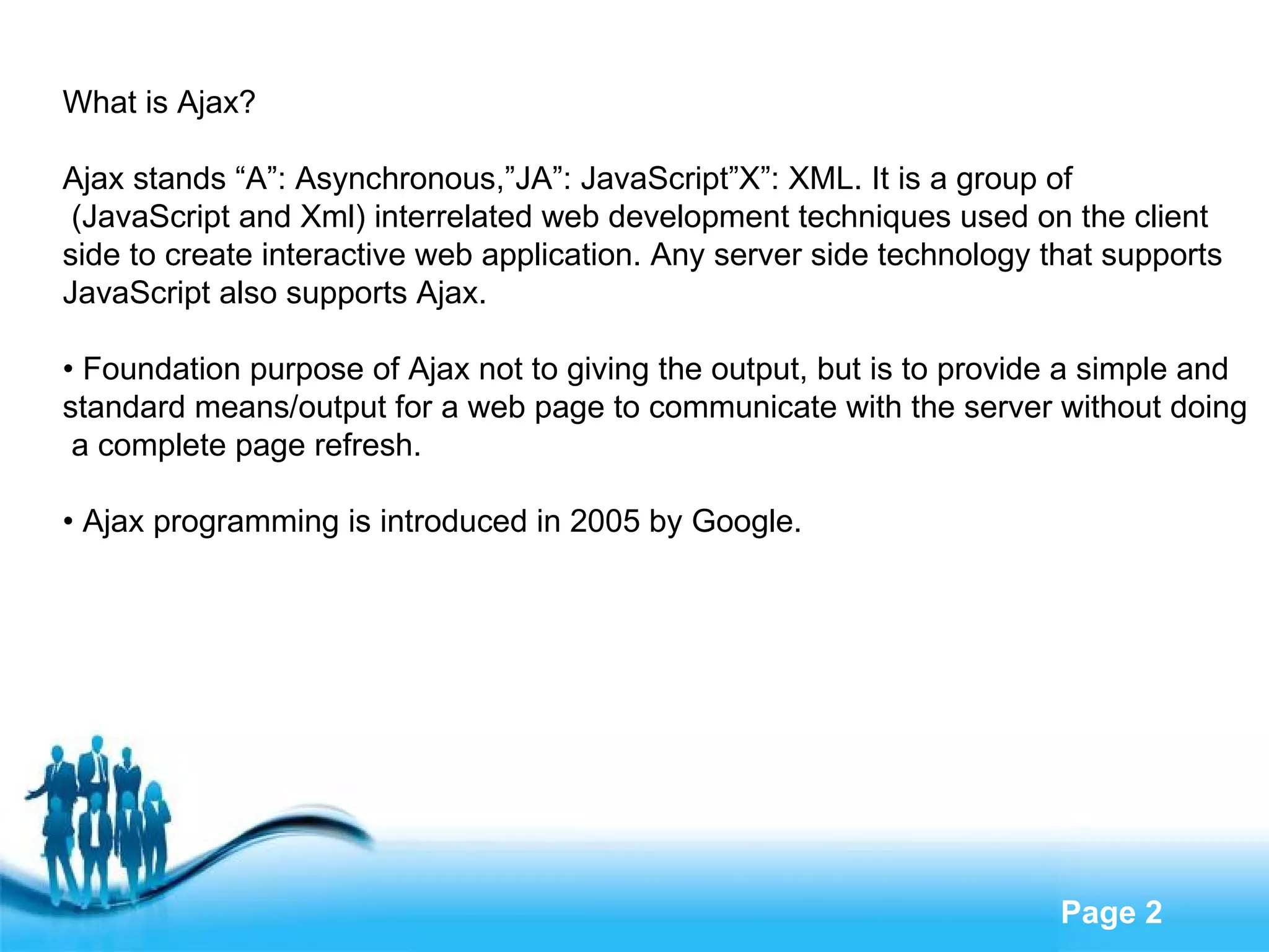 The document discusses Ajax, which uses a combination of technologies like HTML, JavaScript, XML and CSS to retrieve data from a server asynchronously in the background without interfering with the display and behavior of the existing page. It explains what Ajax is, the technologies used, how it works using XMLHttpRequest object, and provides an example of creating an Ajax request and handling responses from the server. It also touches upon drawbacks and browser compatibility issues with Ajax.