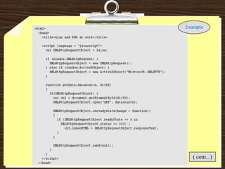 The document provides an overview of AJAX (Asynchronous JavaScript and XML) as a methodology that enhances web application interactivity by using various web technologies. It outlines the historical development of AJAX, emphasizing its importance for better user experience, reduced maintenance costs, and improved resource sharing. However, it also notes some drawbacks such as dependency on JavaScript and challenges with search engine indexing.