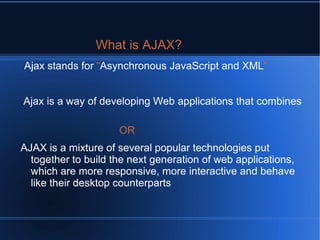 AJAX is a web development technique that allows web pages to be updated asynchronously by exchanging small amounts of data with the server behind the scenes, allowing web pages to change content without reloading. It stands for Asynchronous JavaScript and XML. Some common examples of sites using AJAX are Gmail, Google Maps, and Flickr.