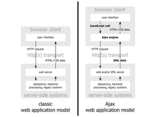 The document outlines the fundamentals of Asynchronous JavaScript and XML (AJAX), emphasizing its role in creating more responsive web applications by allowing asynchronous communication between clients and servers. It discusses the benefits of AJAX compared to traditional web applications, such as improved user interaction and reduced wait times for content updates. The document also details the underlying technologies and processes involved in AJAX operations, including XMLHttpRequest and handling responses.
