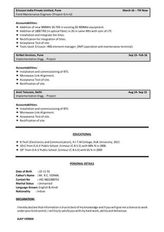 This document is a resume for Ajay Verma, who has over 2 years of experience in the telecom sector installing and commissioning microwave and BTS equipment. He is currently working as a Field Maintenance Engineer for Ericsson India Private Limited on various 4G, 3G, and 2G network integration projects. Prior to this, he worked for AirNet Services and Ariel Telecom on BTS installation, commissioning, and site integration projects. He holds a B.Tech in Electronics and Communication and is seeking challenging assignments to further his career in the telecom sector.