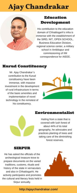 The strong minister in Chhattisgarh, Ajay Chandrakar Ji manages a number of responsibilities and portfolios as panchayat and rural development department, health, family welfare and medical education. Source(S) : http://www.ajaychandrakar.com/