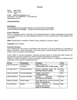 Ajay Kumar is seeking a position in accounts, administration, finance or management. He has over 15 years of experience in finalizing books of accounts, audit, financial analysis, cost reduction and control. Most recently, he served as Group Finance Controller for Alpha Oman LLC from 2012 to 2016. He holds qualifications as a Cost & Management Accountant and Chartered Accountant. His skills include organizational abilities, leadership, problem solving, and being analytical.