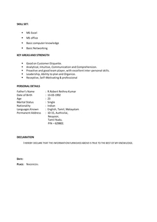 This document summarizes the applicant's educational qualifications, professional experience, skills, and personal details. The applicant has a B.E. in Electrical & Electronics Engineering from Anna University with 65.6% marks. They have over 1 year of work experience as a Client Service Delivery Analyst at NASDAQ and previously worked as a Consultant at Sutherland Global Services. Their skills include MS Excel, MS Office, basic computer and networking knowledge. They are analytical with good communication skills and able to work well in a team.