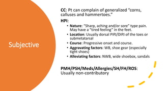 The document provides guidance on evaluating and treating lesser toe, lesser metatarsal, and 5th metatarsal deformities. It describes the subjective and objective findings to look for in the history and physical exam. It then outlines the various conservative and surgical treatment options for addressing the underlying biomechanical issues causing these forefoot deformities.