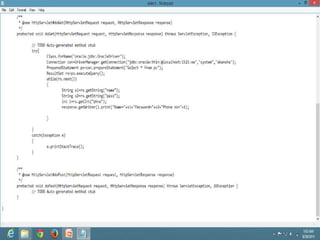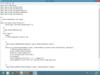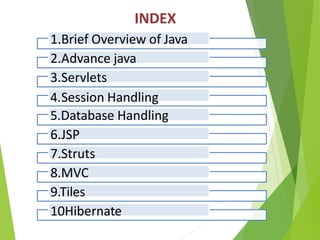 This power point presentation provides an overview of advance Java topics including servlets, session handling, database handling, JSP, Struts, MVC, and Hibernate. It begins with a brief introduction of Java and its history. It then discusses advance Java topics like J2EE, servlets, session handling using different techniques. It also covers database handling using JDBC and topics like JSP, Struts framework, MVC pattern, Tiles framework, and Hibernate for object-relational mapping.