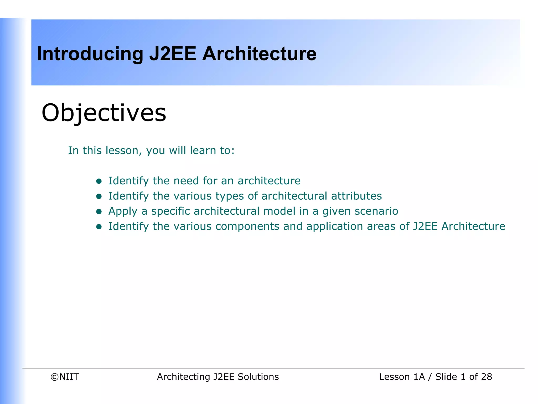 This document provides an overview of J2EE architecture. It defines architecture as the study of designing J2EE applications and discusses architectural concepts like attributes, models, and terminology. It describes the role of an architect and phases of architectural design. The document outlines the various components of J2EE like clients, web components, business components and containers. It also discusses key aspects of J2EE architecture like application areas, issues, technologies and available application servers.