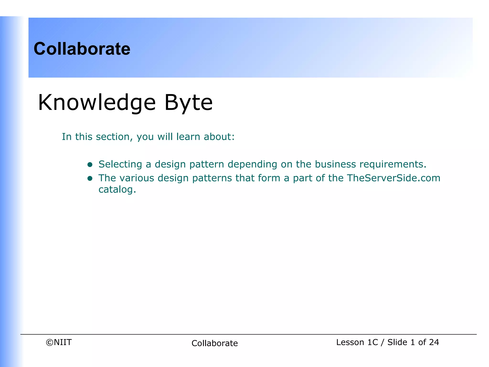 This document discusses design patterns and selecting appropriate patterns based on business requirements. It provides an overview of design patterns available in TheServerSide.com pattern catalog, which are organized into categories like EJB layer architectural patterns, inter-tier data transfer patterns, transaction and persistence patterns, and client-side EJB interaction patterns. Examples of patterns in each category are described. Best practices for developing class diagrams and using proven design patterns are also mentioned.