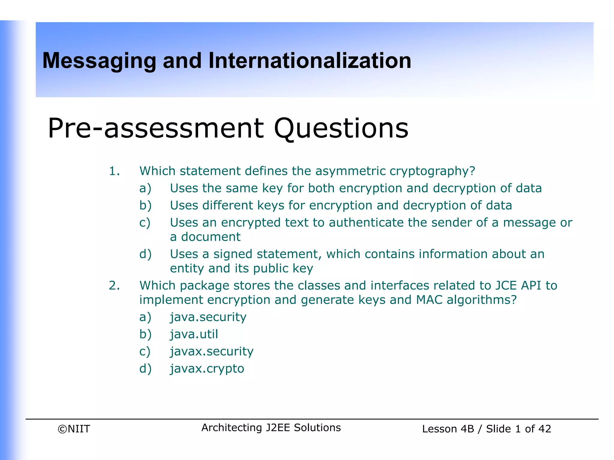 The document discusses messaging and internationalization. It covers messaging using Java Message Service (JMS), including the need for messaging, messaging architecture, types of messaging, messaging models, messaging servers, components of a JMS application, developing effective messaging solutions, and implementing JMS. It also discusses internationalizing J2EE applications.