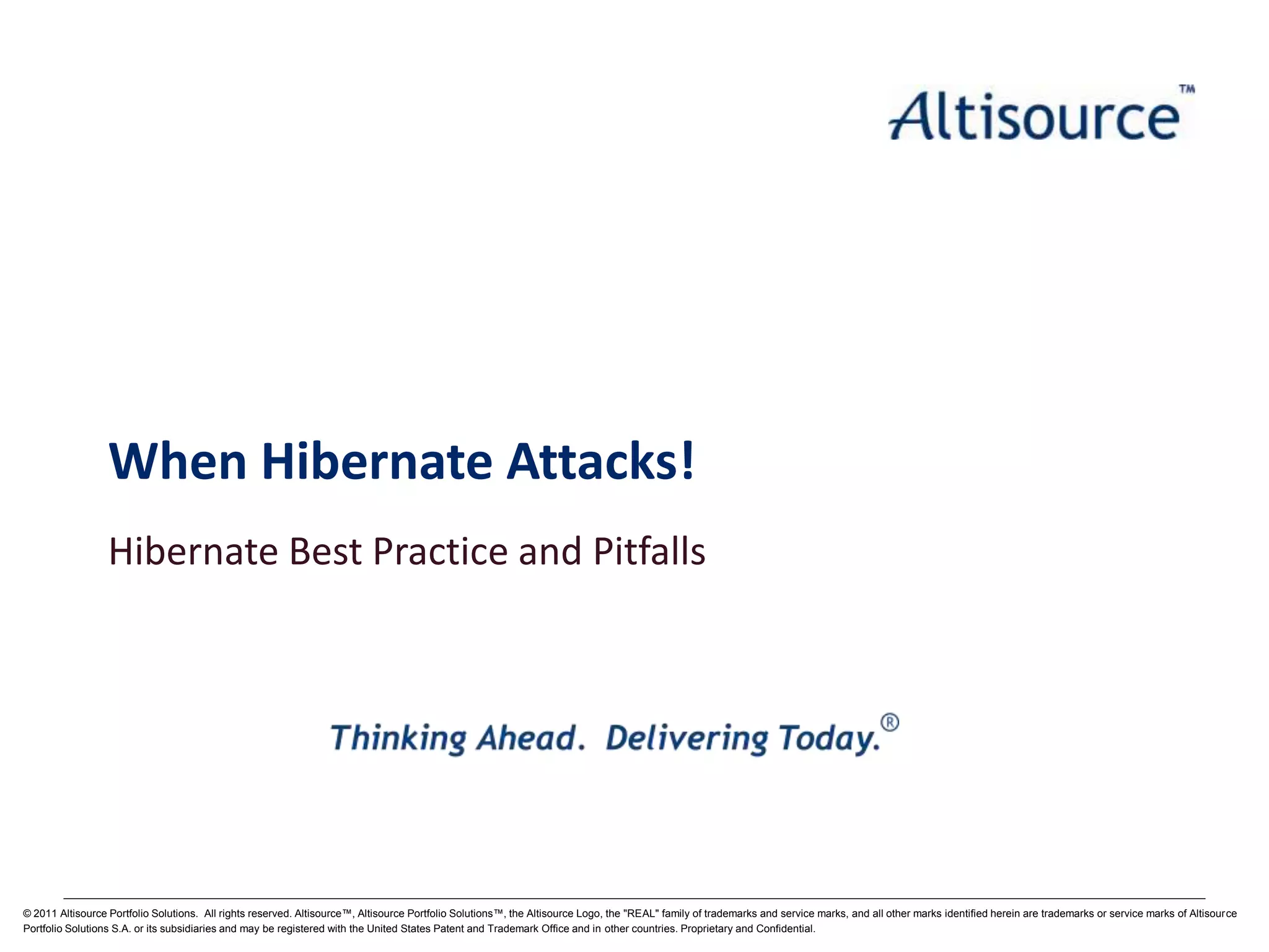 The document discusses common issues that can arise when using Hibernate, an object-relational mapping tool for Java. It begins by introducing Hibernate and its basic functionality. Some key issues covered include developers not having a solid understanding of databases and SQL, which can lead to performance and schema problems. Specific issues examined are n+1 query problems, lazy initialization exceptions, and out of memory errors during batch processing. Solutions provided emphasize the importance of working with a database administrator, using Hibernate appropriately for simple CRUD operations, and addressing underlying database performance issues.