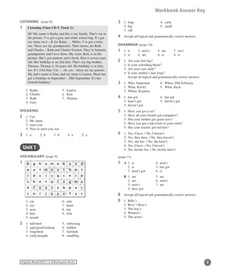 The document contains a vocabulary exercise from an English textbook. It lists various words related to school supplies, colors, numbers, days of the week, dates, and adjectives. It then provides grammar exercises involving subjects, possessive adjectives, the verb "to have/have got", and describing people. The document aims to teach English vocabulary and grammar concepts around describing people, possessions, and characteristics.