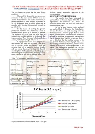 The document compares the flexural behavior of reinforced concrete beams and prestressed concrete beams. It discusses the materials and specifications used, including concrete grades of M20 for reinforced concrete and M35 for prestressed concrete. An experimental program is described that involved casting and testing beams of both types with the same cross-section but different reinforcement. The results showed that prestressed concrete beams had 12.4% higher moment resistance and 60% less ultimate deflection compared to reinforced concrete beams. Prestressed beams also had a higher cracking moment and shear failure rather than flexural failure. Overall, the prestressed concrete beams exhibited better structural behavior than the reinforced concrete beams.
