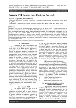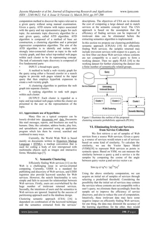 This document summarizes a research paper on using clustering approaches to improve the discovery of semantic web services. It begins by defining semantic web services and semantic similarity measures. It then discusses using clustering to eliminate irrelevant services from a collection before applying semantic algorithms. Specifically, it proposes a clustering probabilistic semantic approach (CPLSA) that filters services based on compatibility with a query before clustering the remaining services into semantically related groups using probabilistic latent semantic analysis (PLSA). The document concludes by discussing applications of approximate semantics and challenges in scaling semantic algorithms.