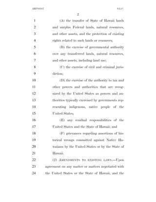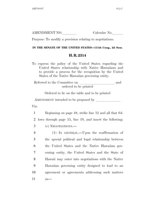 This document is an amendment to a bill regarding negotiations between the United States, Hawaii, and a Native Hawaiian governing entity. It strikes existing text and replaces it with provisions establishing parameters for negotiations and the authority of the Native Hawaiian governing entity during negotiations. Key points include: allowing negotiations on land transfers, authorities, and grievances; proposing amendments to laws after agreements; and limiting the entity's authority until implementing legislation is passed.