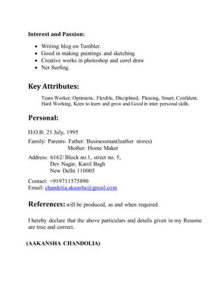 This resume is for Aakansha Chandolia, who is currently pursuing a Bachelor's degree in Journalism and Mass Communication. She has experience working on projects like college festivals and media events. She also has skills in Microsoft Office, Photoshop, Corel Draw, and handling public relations campaigns. Her interests include writing, art, design, and staying up to date on news online. She aims to find an internship that allows for growth and learning.
