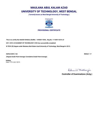 Maulana Abul Kalam Azad University of Technology, West Bengal issued a provisional certificate to Akash Shukla, who completed his B.Tech in Electronics and Instrumentation in 2015 from Academy of Technology with a DGPA/CGPA of 7.65 and result of P. The certificate certifies that Akash Shukla, with roll number 16900511004 and registration number 111690110316, successfully completed his B.Tech degree from the University in 2015.