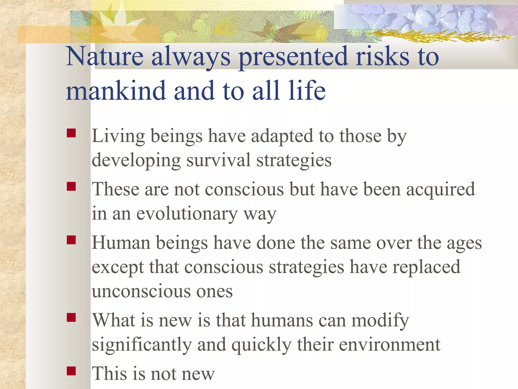 The document discusses the relationship between human societies and the natural environment. It notes that while nature always posed risks, human societies have now developed the ability to significantly modify their environment quickly. This introduces new risks from uncoordinated human activities that can impact natural systems. The document examines different types of risks from nature, society, and problems of social cooperation/coordination. It also discusses the assessment of environmental risks and different approaches like cost-benefit analysis and risk management. Property rights regimes and common resource issues are evaluated in the context of sustainability and management of exhaustible resources.