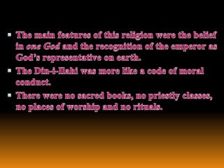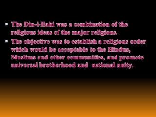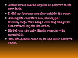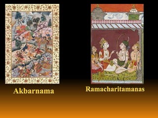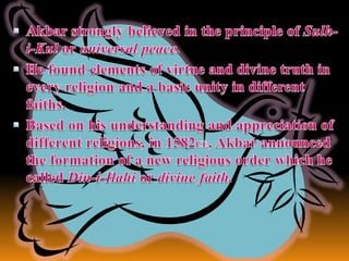 The document details the resistance of the Rajputs against Mughal rule, focusing on Rana Pratap's struggle and Akbar's military conquests across India, establishing a powerful centralized governance system. Akbar's policies promoted religious tolerance and integration of diverse cultures, fostering loyalty among Hindu subjects, especially the Rajputs. His reign was marked by significant administrative reforms, artistic contributions, and efforts to unite various traditions and communities under one empire.
