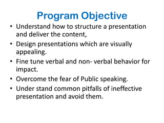 The document provides guidance on basic presentation skills. It discusses structuring presentations, overcoming public speaking fears, and avoiding common pitfalls. It emphasizes the importance of planning, preparing, practicing, and delivering presentations effectively. Key aspects include gaining audience attention, creating desire, using visual aids, maintaining eye contact, and practicing vocal techniques and non-verbal communication. Introductions should attract interest and tell the audience what will be covered.