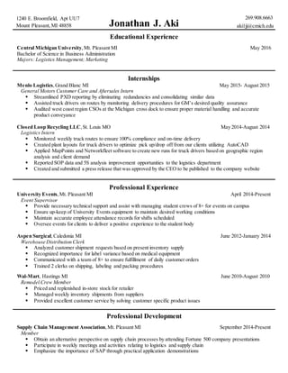 Jonathan J. Aki has a Bachelor of Science in Business Administration with majors in Logistics Management and Marketing from Central Michigan University. He has internship experience in logistics and customer service roles at Menlo Logistics and Closed Loop Recycling, where he streamlined reporting, assisted drivers, and ensured on-time deliveries. His professional experience includes event supervision at University Events and distribution work at Aspen Surgical. He is a member of the Supply Chain Management Association to expand his industry knowledge.