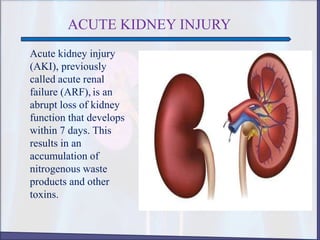Acute Kidney Injury (AKI) is a rapid loss of kidney function classified into three categories: pre-renal, renal (intrinsic), and post-renal, each with distinct causes and clinical manifestations. Diagnosis involves history-taking, physical examination, and various imaging and lab tests, while management focuses on rapid diagnosis and supportive care, including monitoring and potential renal replacement therapy. Preventive strategies include risk identification, avoiding nephrotoxic agents, and optimizing renal perfusion, with specific treatments for associated complications such as hyperkalemia and acidosis.