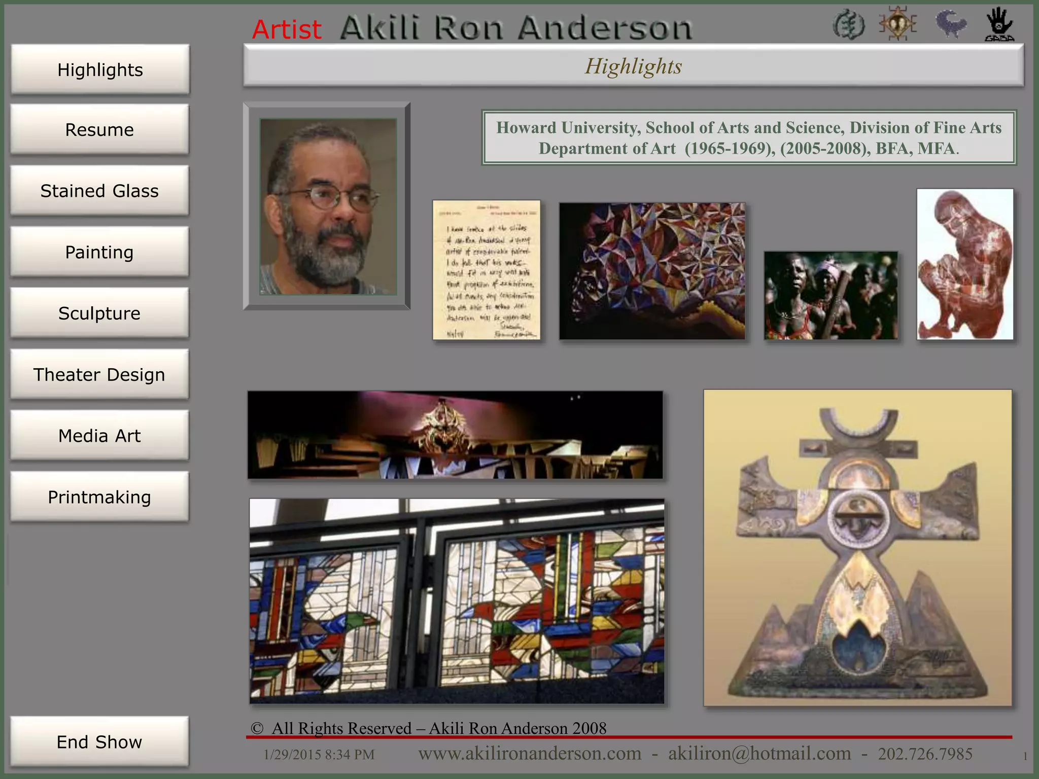 Akili Ron Anderson is an artist based in Washington D.C. who has practiced as a full-time visual artist for over 30 years. He produces stained glass windows, sculptures, paintings, and theater sets. The document provides details on Anderson's education, positions held, public art commissions, exhibitions, and recommendations. It is Anderson's resume and portfolio highlighting his extensive career as an artist specializing in public art installations.