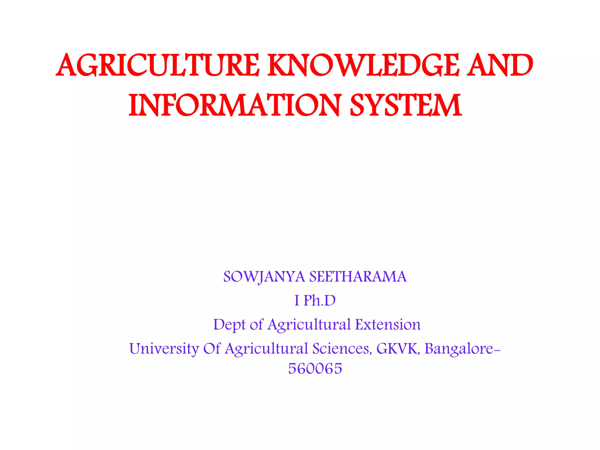 Key components of an ideal AKIS include knowledge generators like universities, knowledge sharers like extension services, and knowledge users like farmers. In India, examples of AKIS initiatives include government programs like AGMARKNET and Kisan Call Centres, as well as private sector programs from ITC e-Choupal and Tata Kisan Sansaar.