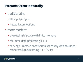 Akka Streams & HTTP provides reactive, asynchronous, and non-blocking streams for processing data and HTTP requests and responses. It builds upon Akka IO and the Reactive Streams initiative to allow stream-based topologies to be declared and run for tasks like processing big data, serving clients simultaneously with limited resources, and building distributed applications that integrate with external systems over HTTP. Key features include stream sources, sinks, and transformations along with a routing DSL for building HTTP servers and clients on top of Akka IO and HTTP Core.