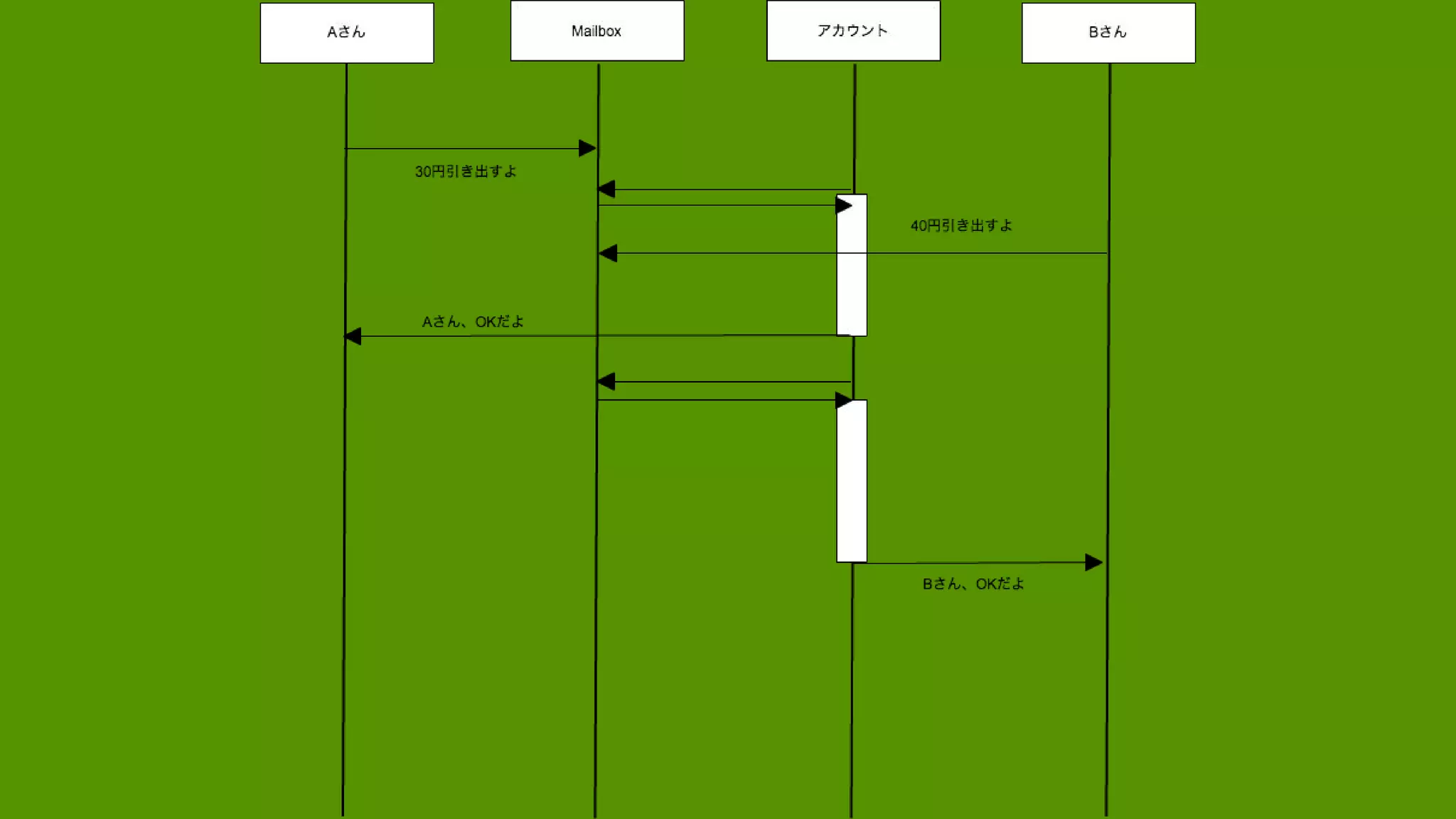 Actorモデルの場合 (Aさん&Bさん) Account 70円 A B 40円引き出すね Mailbox A B -40