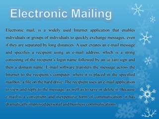 The document discusses the history and development of the Internet. It began as a research project in the 1960s called ARPANET, funded by the U.S. Department of Defense. The Internet was envisioned as an interconnection of networks using TCP/IP protocols. It is composed of many interconnected computer networks that allow computers to share information and processing power globally. The Internet uses client-server architecture, with applications like the World Wide Web, email, file transfers, and online discussions. It has transformed communication, business, education and more through electronic commerce, telecommunications, file sharing and online chatting.